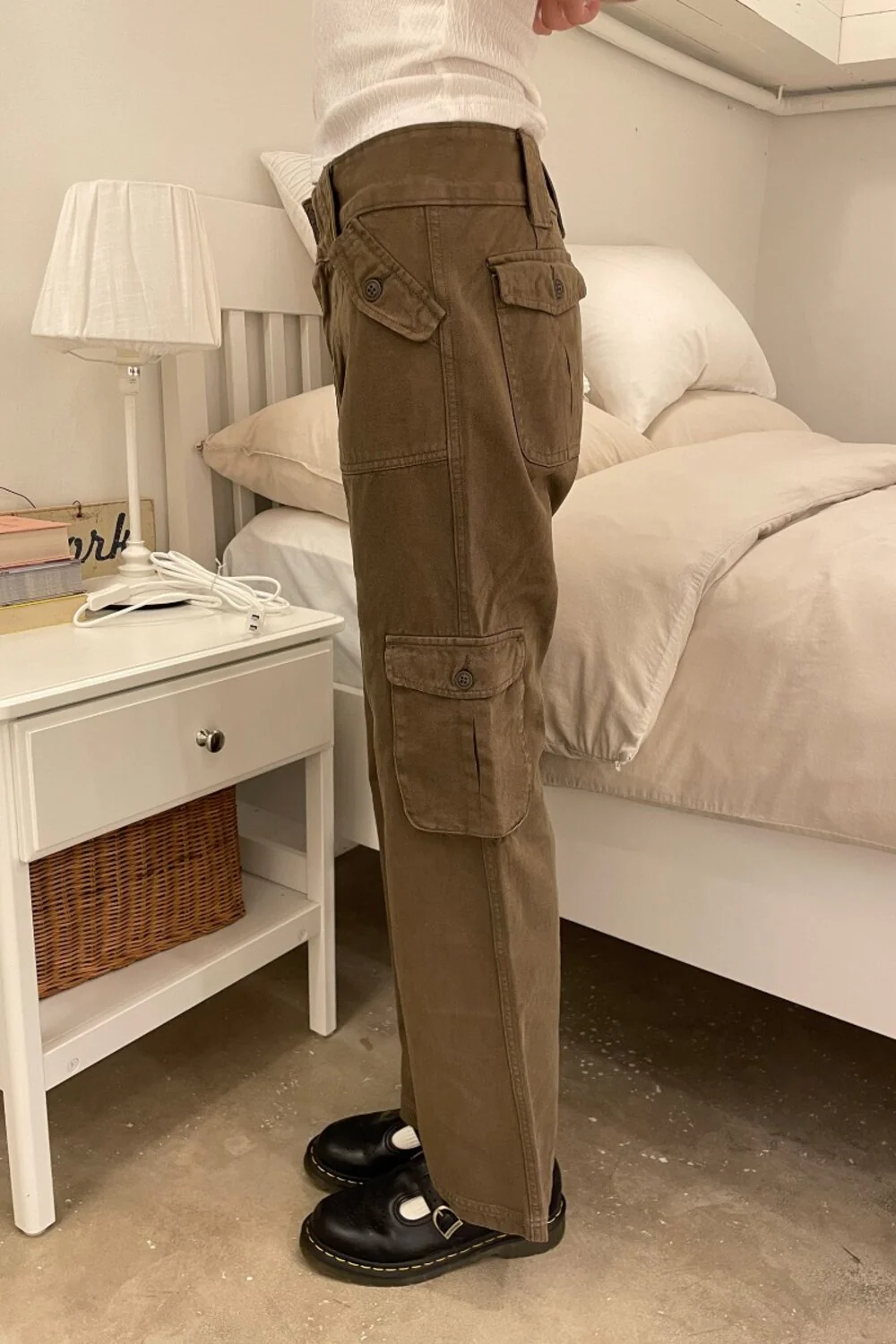 Low rise straight leg pants, with cargo pockets, belt loops, and a zip closure.