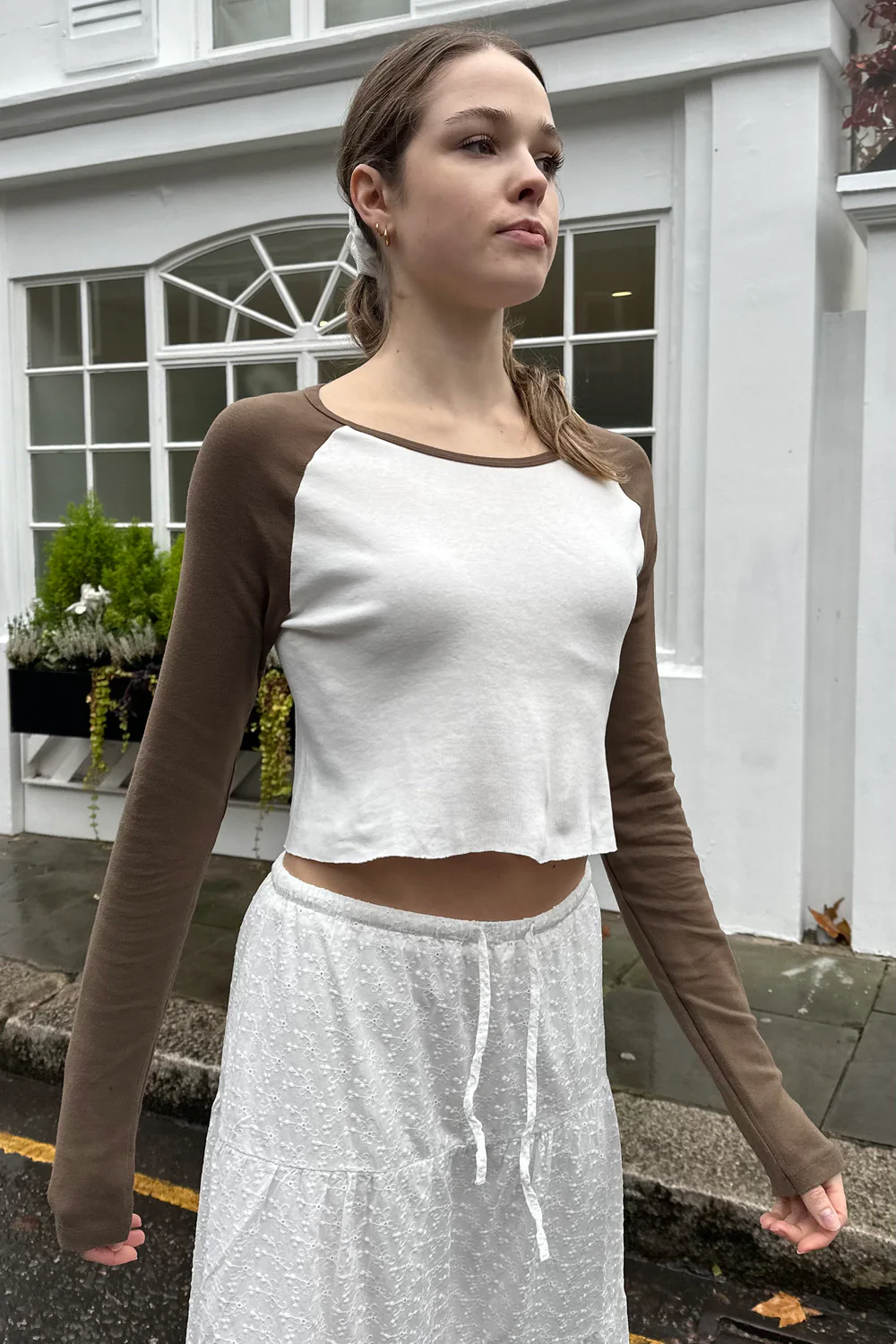 Cropped, cotton top with raw hem, and brown long sleeves.