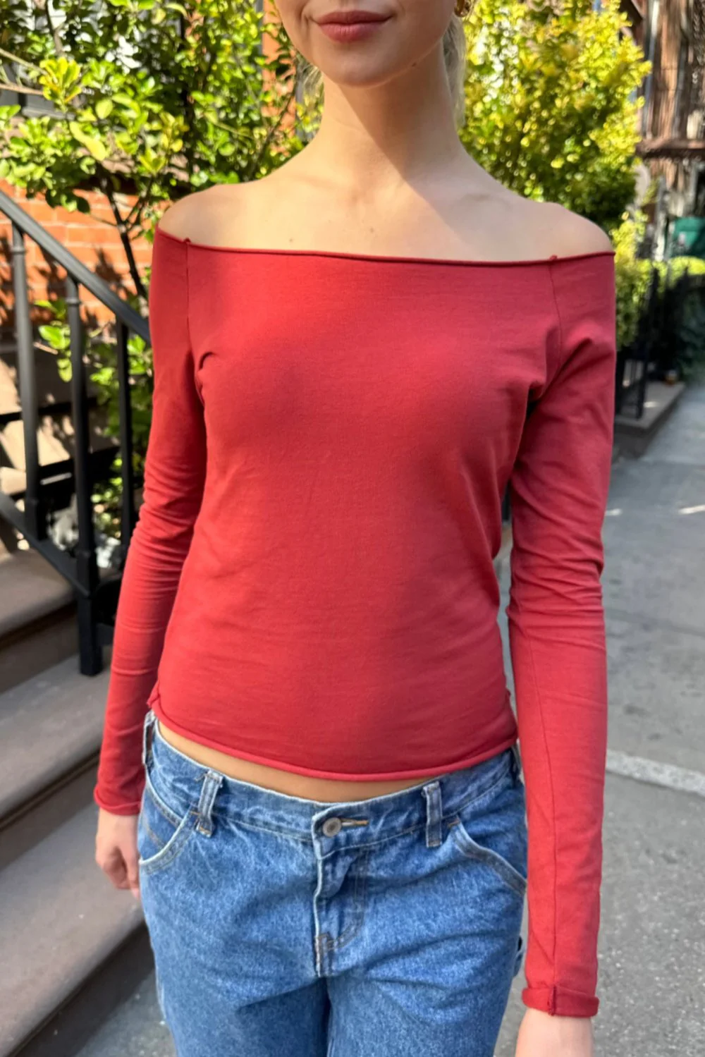 Cotton blend off the shoulder long-sleeve top with a raw hem.