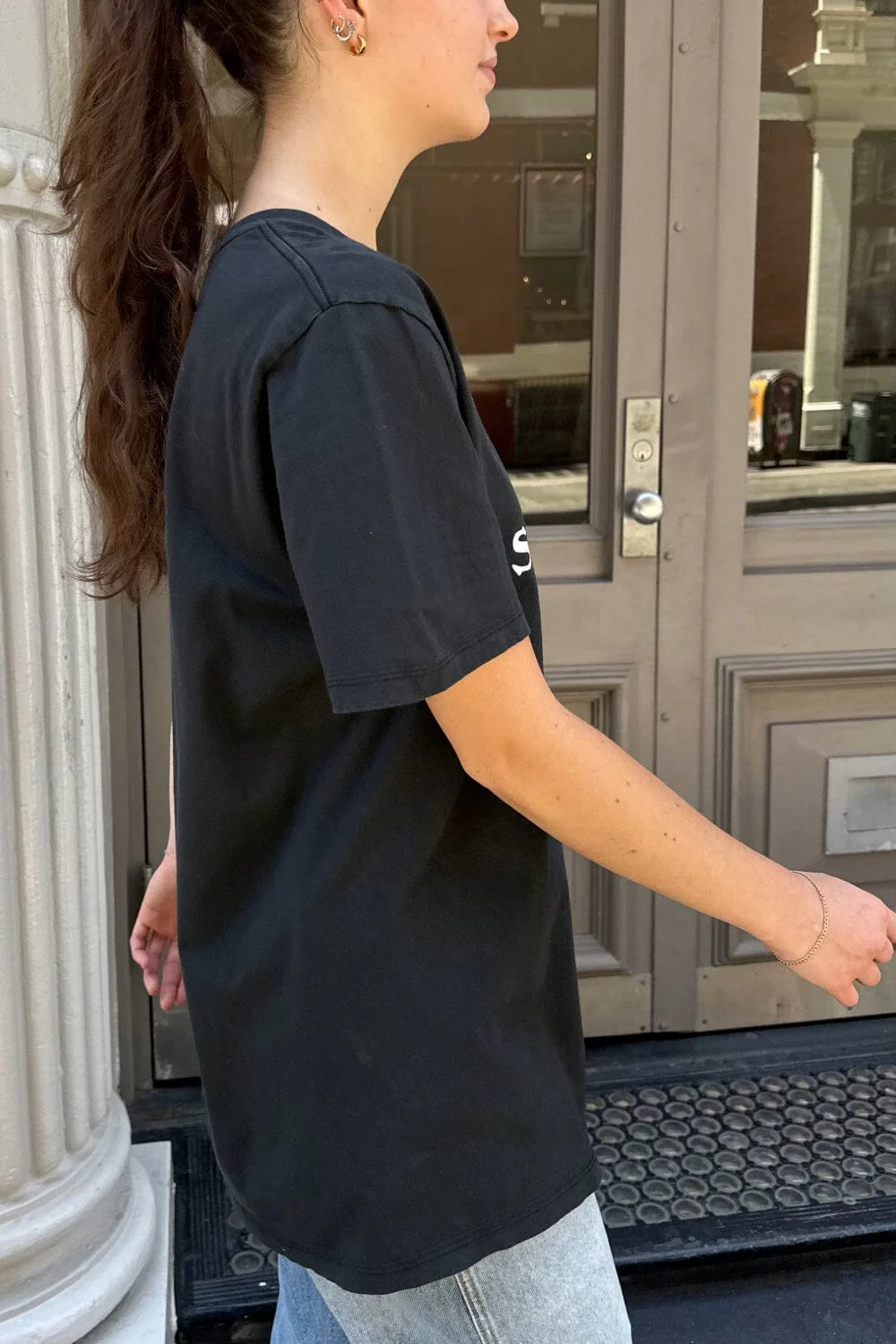 Oversized fit, black, short-sleeved top with Brooklyn Southside Guitars printed on the chest in white.