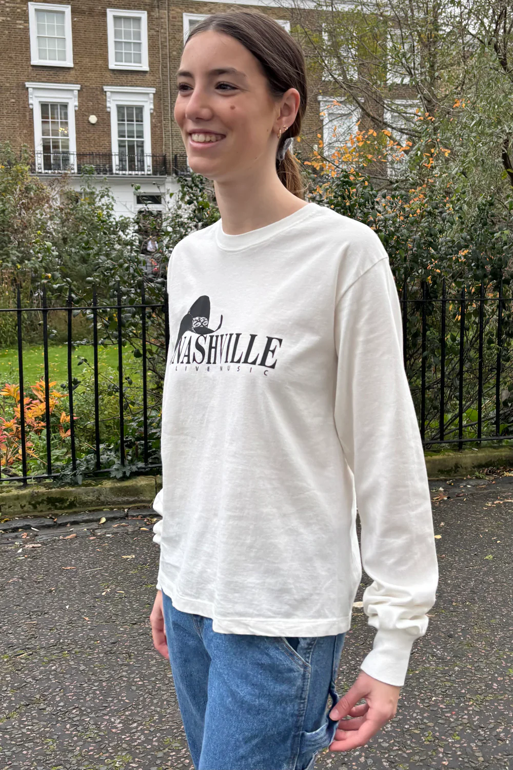 Long sleeve, crewneck top in white with the Nashville graphic printed on the chest.Â