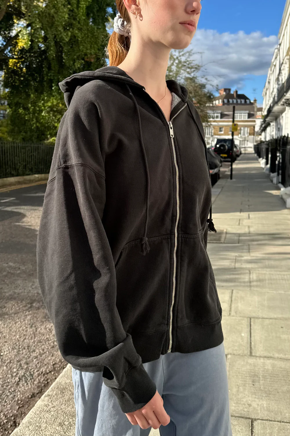 Basic, zip-up hoodie with two pockets and a drawstring hood.