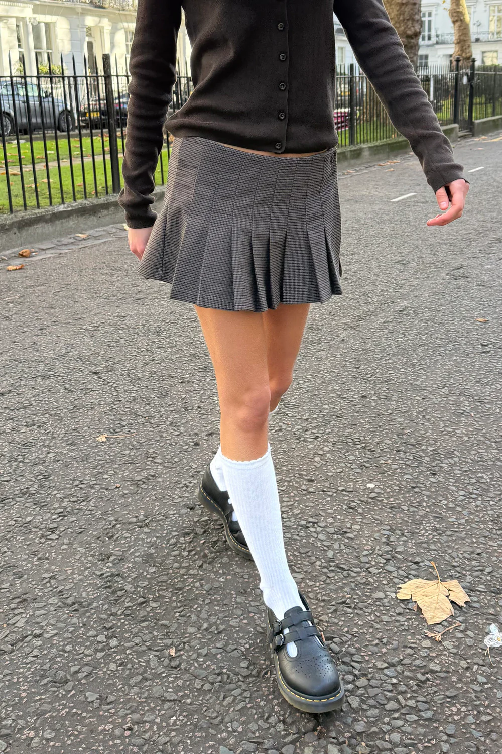 Pleated skirt with adjustable waist with buttons on the side.