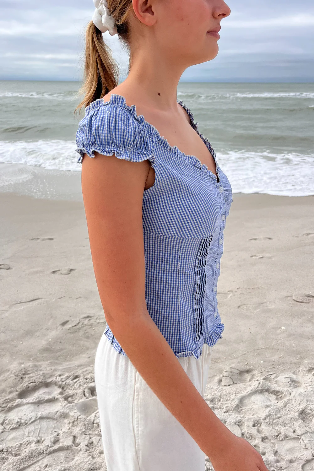 Short sleeve checkered cotton top with ruffle detailing, a seem under the bust, button up.
