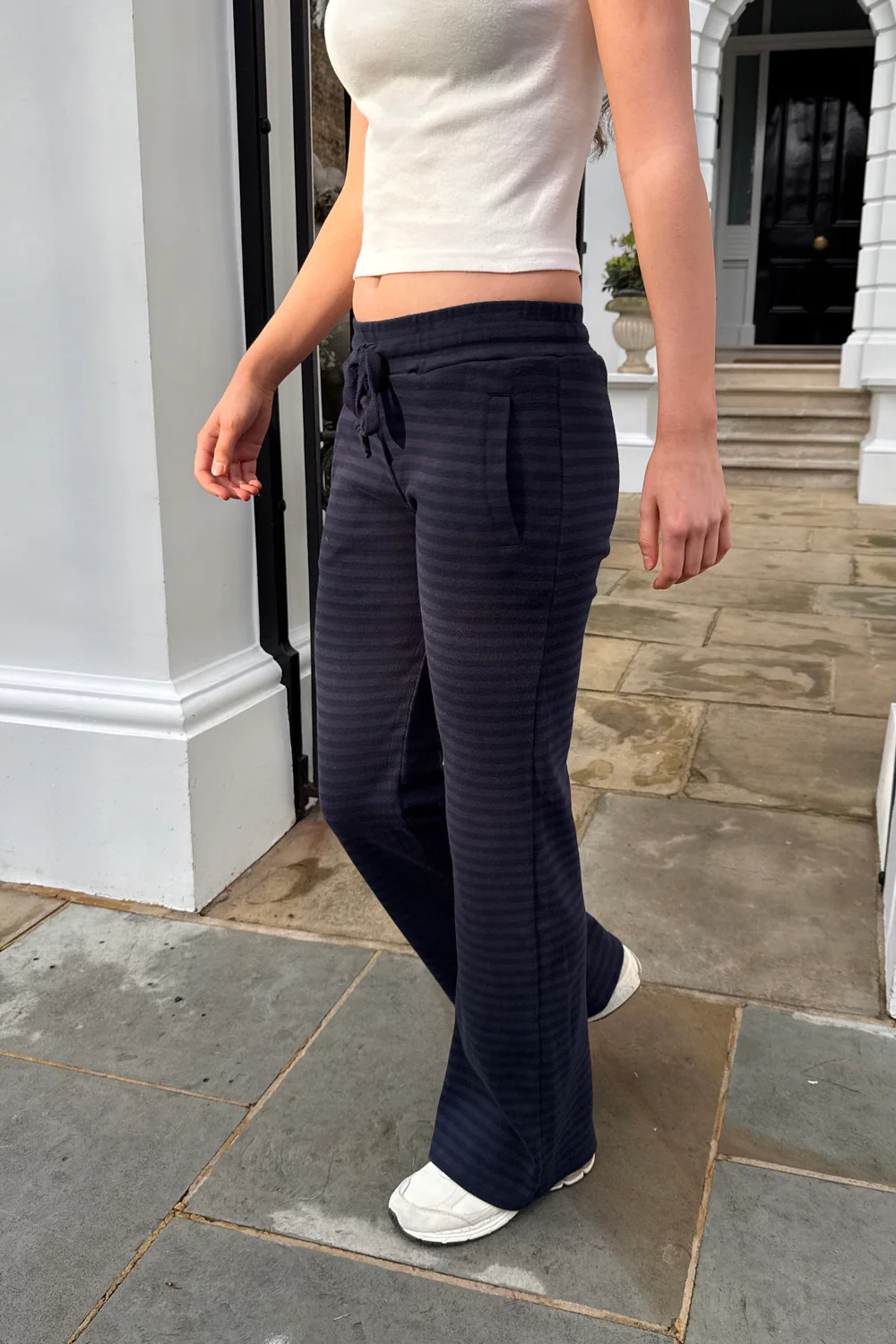 Flare leg fit striped pants with a drawstring waist and pockets on the side
