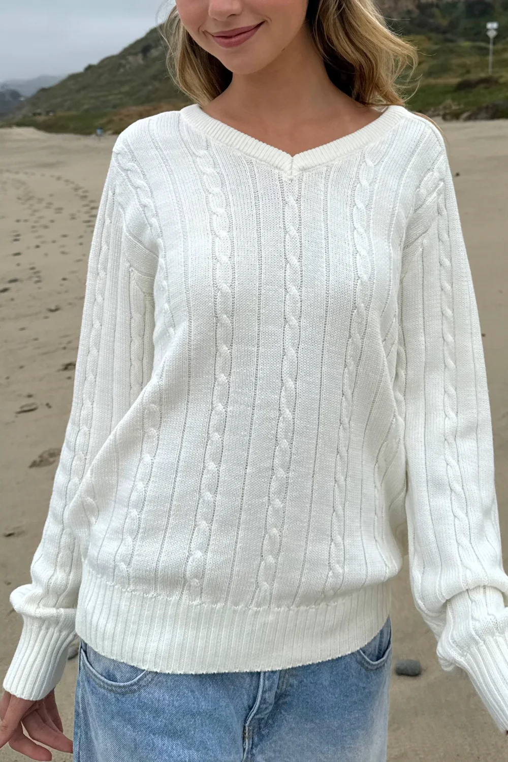 Ida Cotton Cable Knit V-Neck Sweater
