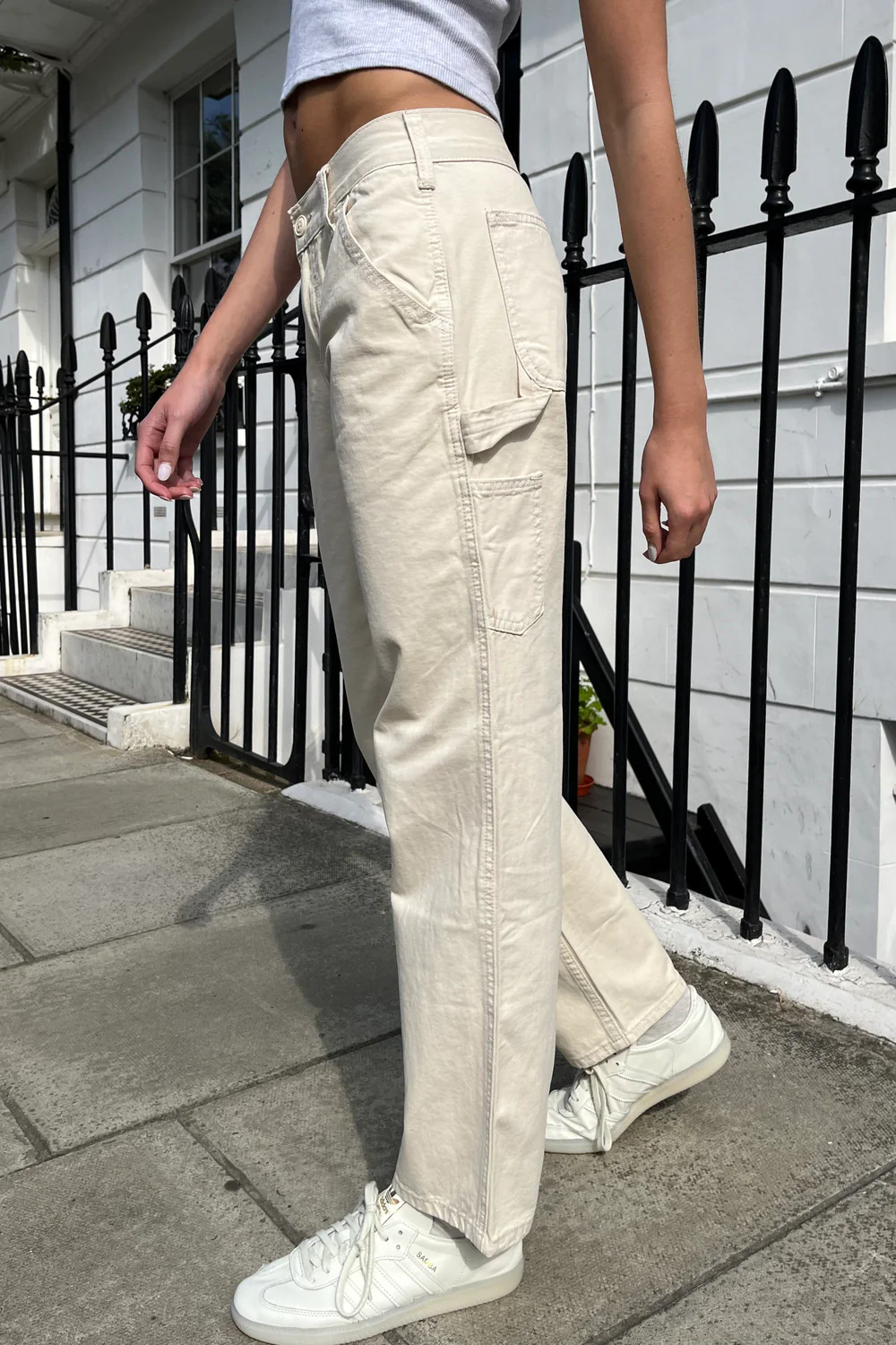 Low-rise, relaxed fit, carpenter-style pants with 8 pockets, belt loops, a white button and zipper closure and a utility loop.