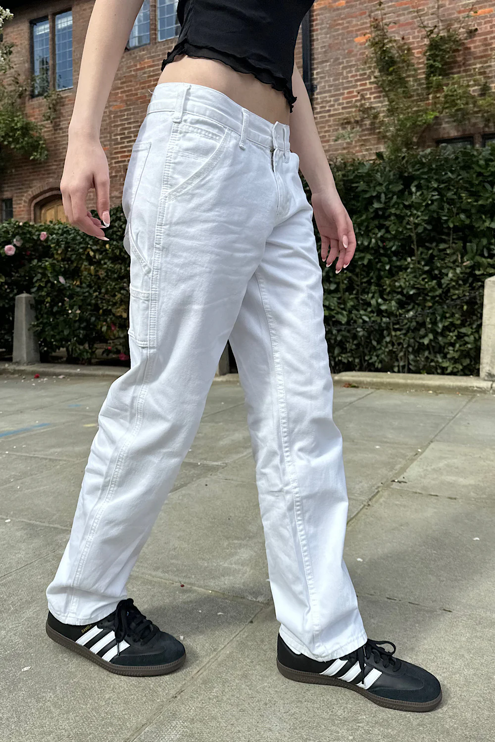 Mid-rise, relaxed fit, cargo-style pants with 8 pockets, belt loops, a white button, zipper closure and a utility loop.