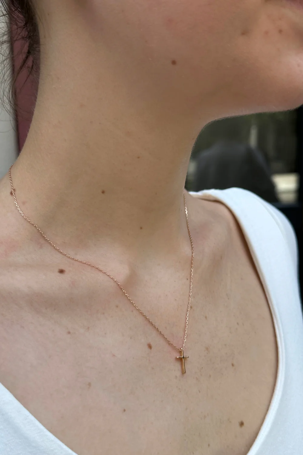 Dainty chain necklace with a small cross charm and adjustable lobster clasp closure.