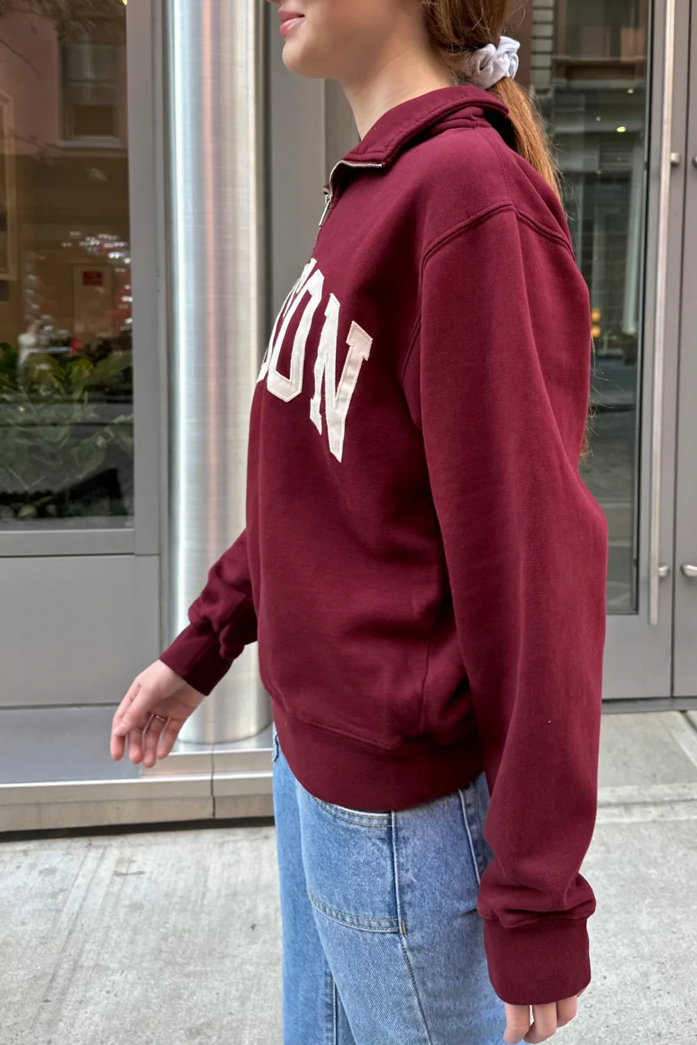 Regular fit soft collared pullover sweatshirt with a silver 1/4 front zip, and boston graphic on front.