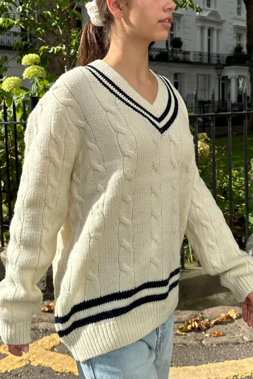 Oversized fit v-neck cable knit sweater.