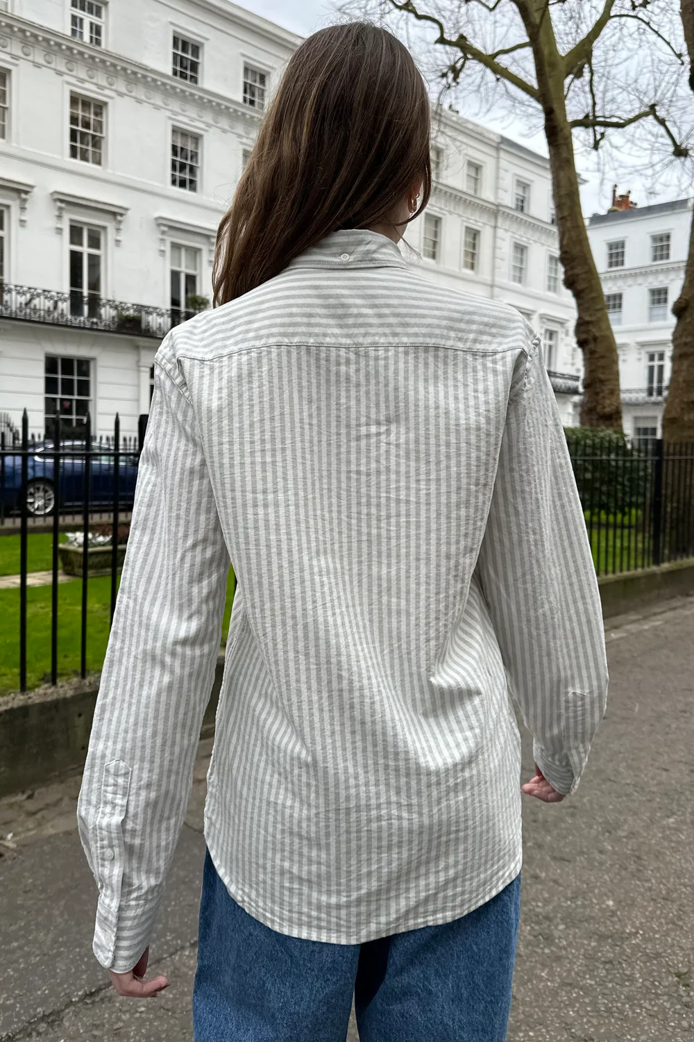 Button-up long sleeve striped shirt top with a collar and buttoned sleeves.