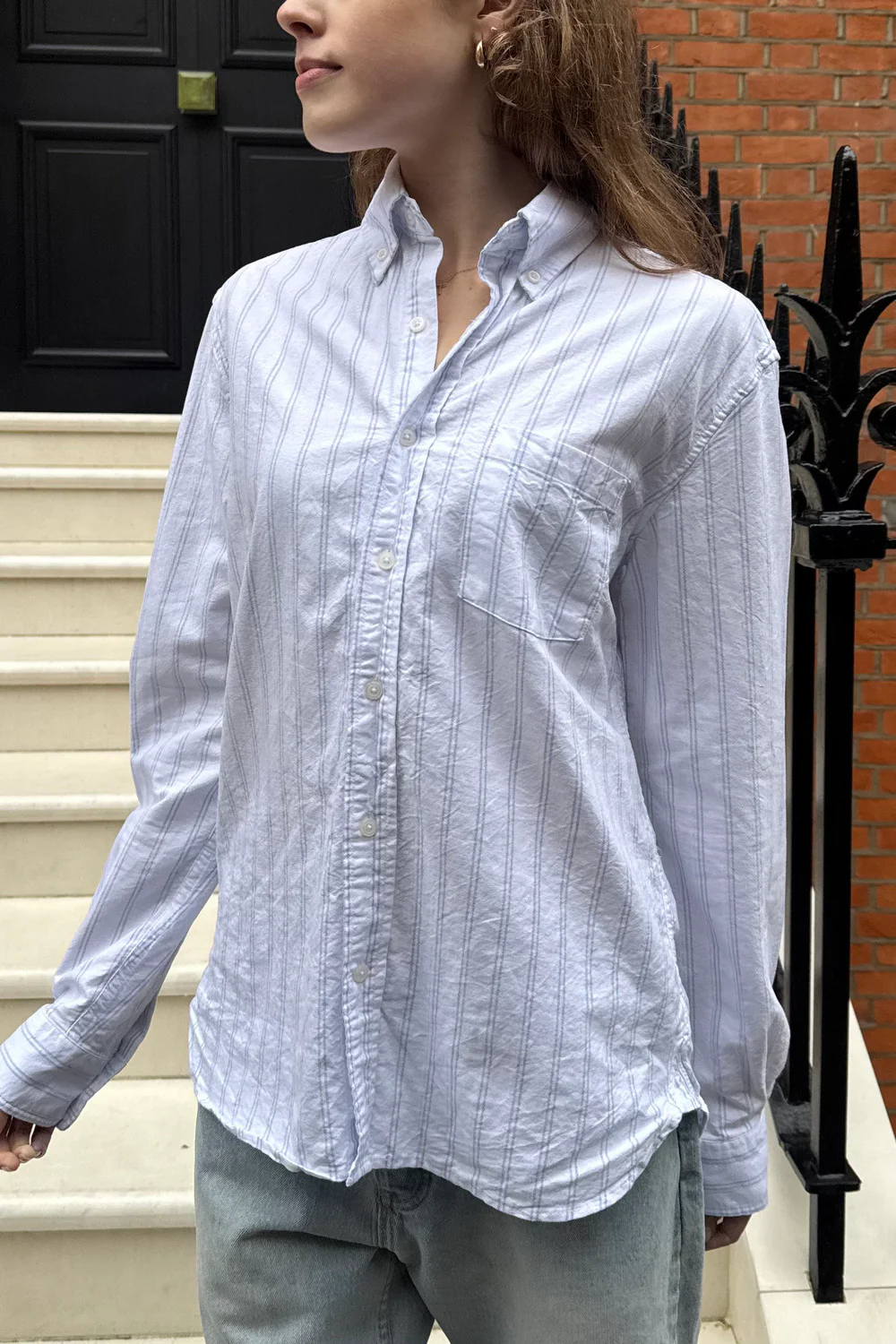 Button-up long sleeve striped shirt top with a collar and buttoned sleeves.