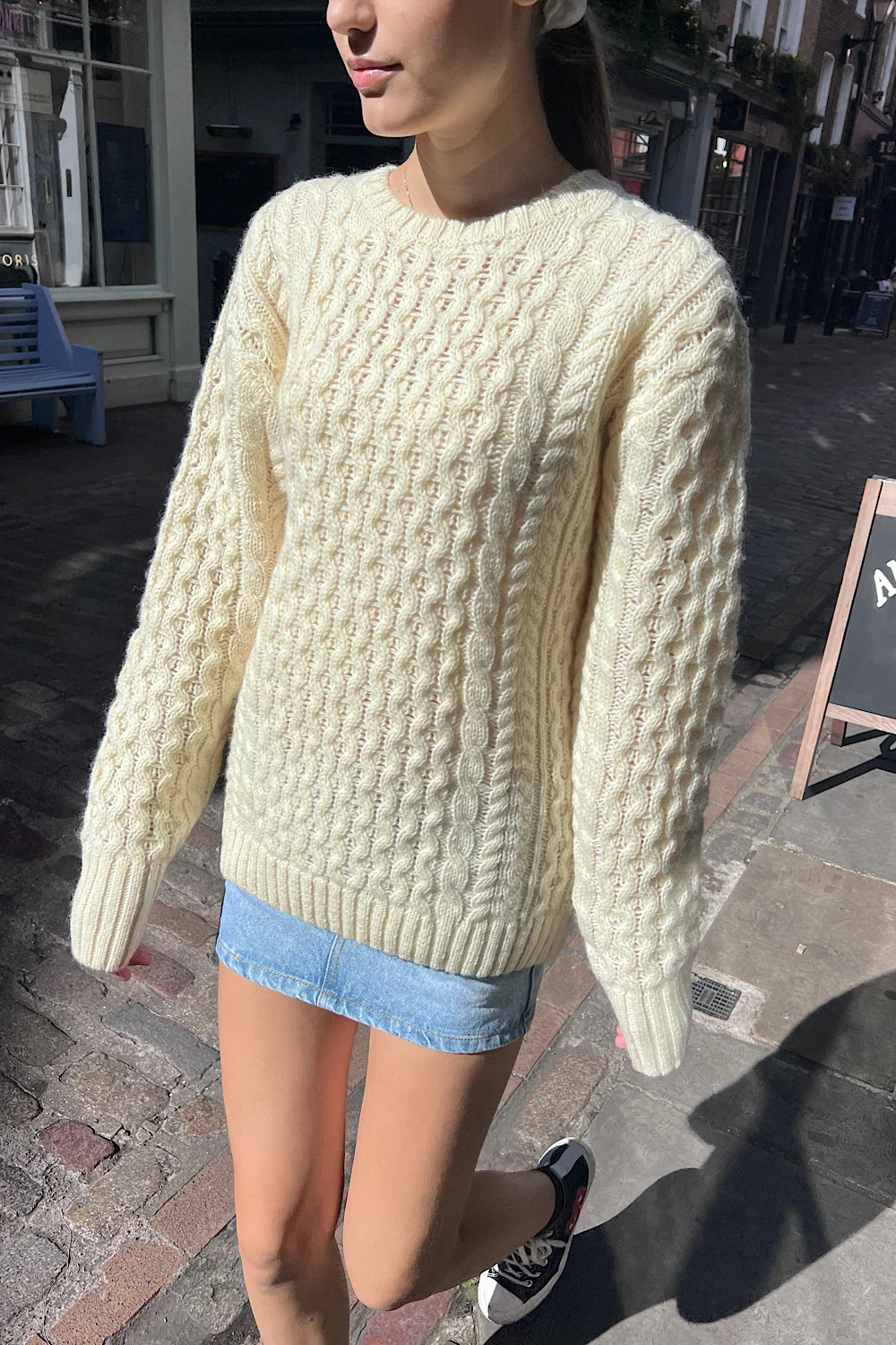 Cozy relaxed thick cable knit drop shoulder sweater with ribbed trimmings and crewneck collar.